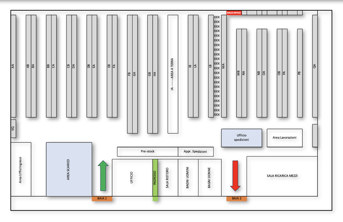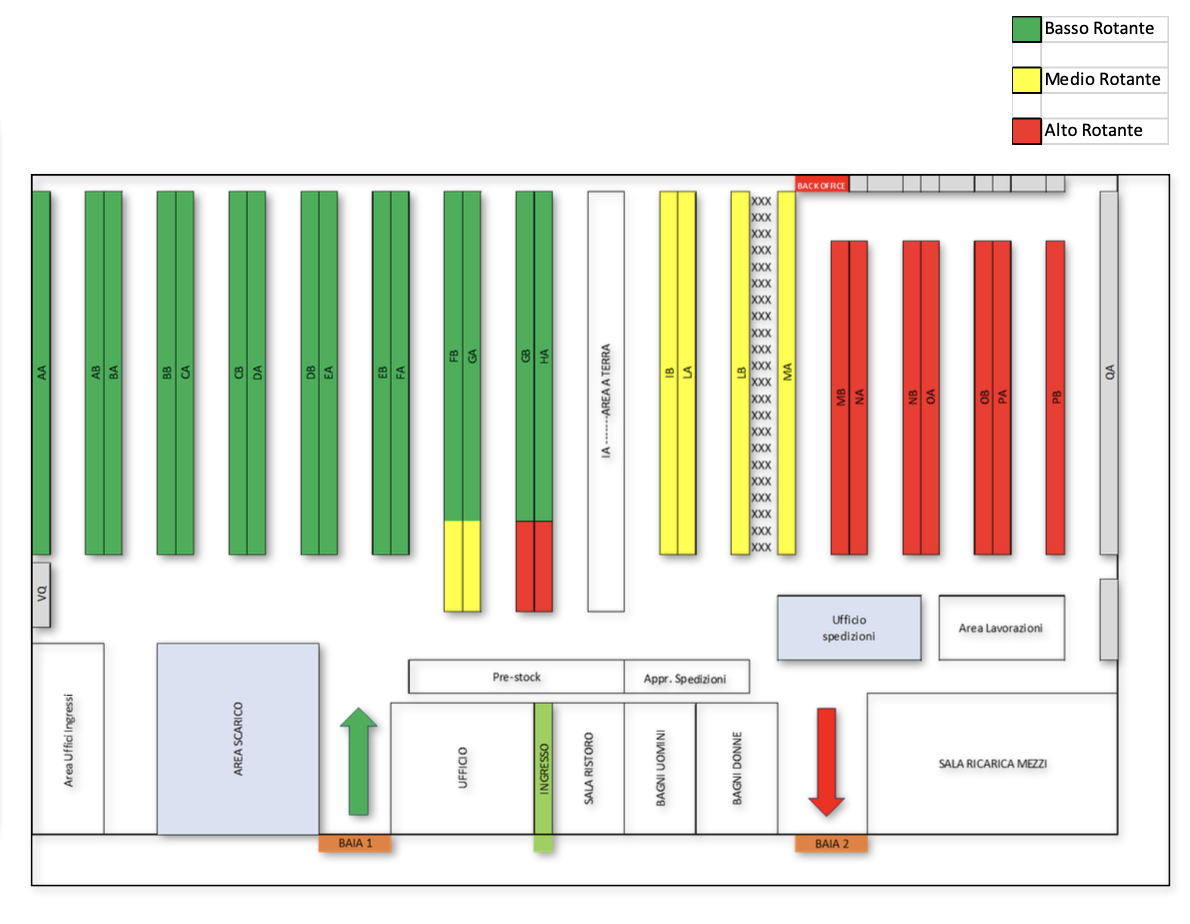 L’operatore impiegato allo stoccaggio posizionerà la merce nelle scaffalature indicate nella mappa. Sulle scaffalature è stato applicato il colore di riferimento.